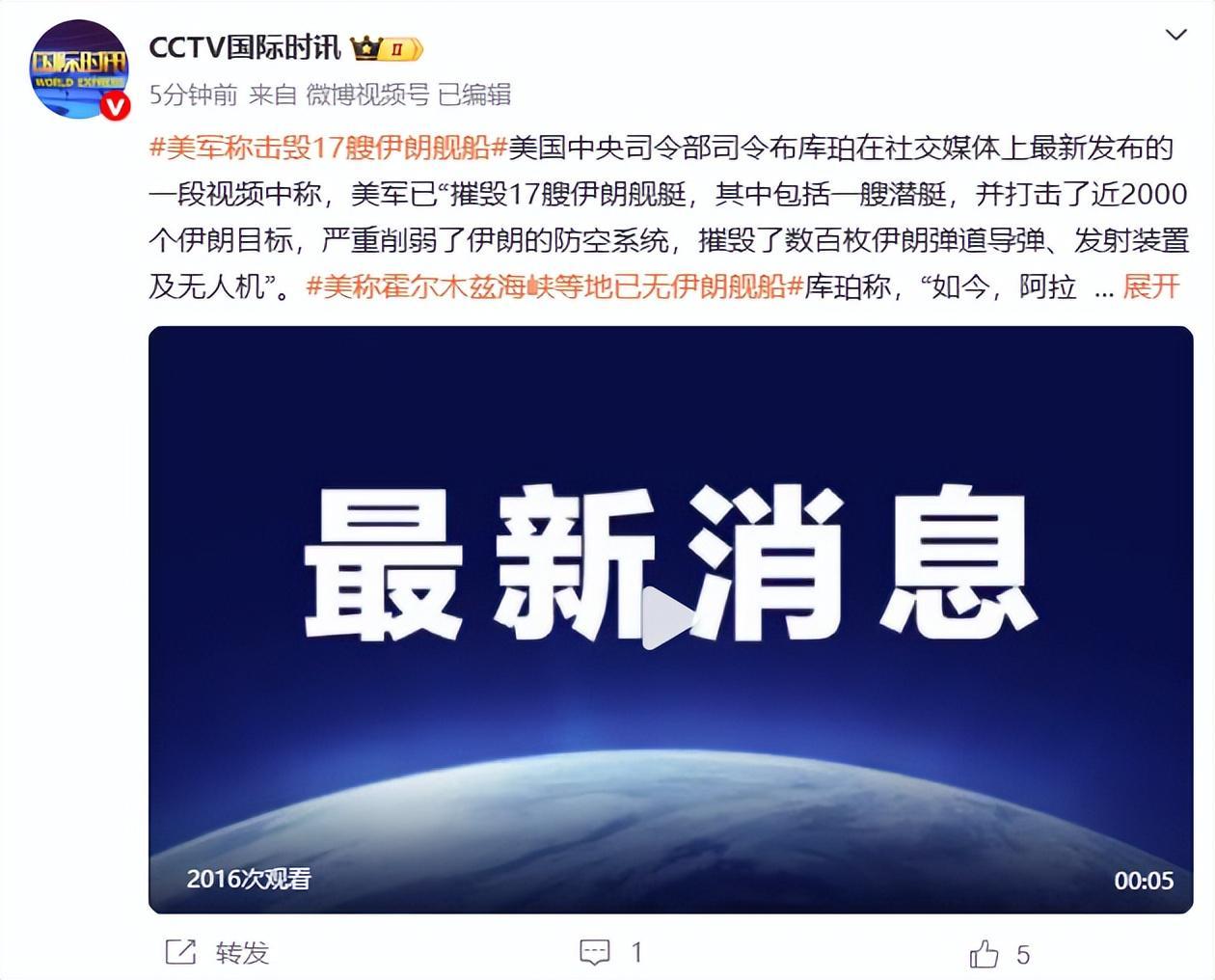 美国:美军已“摧毁17艘伊朗舰艇