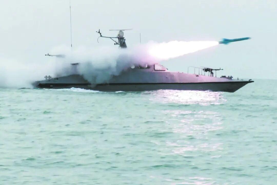 2月16日伊朗军方发布的照片显示,伊朗海军与伊斯兰革命卫队在波斯湾举行联合演习,图为一艘快艇发射导弹