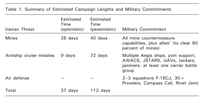 虽然该报告的发布时间并非美国对伊朗发动本轮空袭行动前后,但该报告中的内容仍然具有一定的参考价值,从中可以看出美方对于伊朗战时封锁海峡能力的评估以及对自身动用军事力量破解封锁的能力以及可能付出代价的考量。